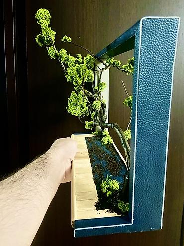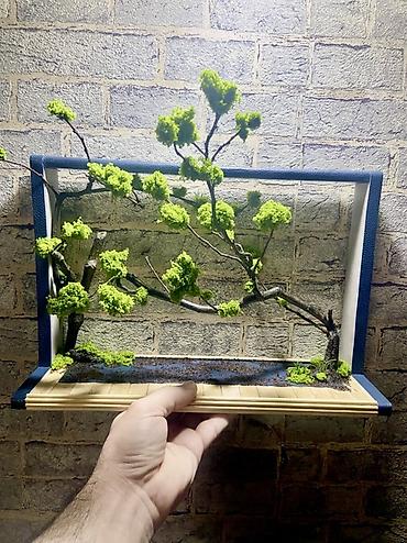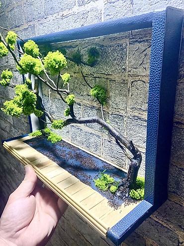 - Dizayn: bonsai estetikasında qurulmuş asimmetrik budaq xətti, boyunca mamır “toppaları”, kənarlarda xırda ot detallar; alt hissədə taxta lövhəcik imitasiyalı platforma