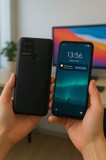 Smartfon – qara rəng, iri ekranlı, damla-notch ön kamera dizaynı.