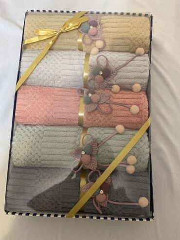 - Dizayn: qızılı lentlə bəzədilmiş hədiyyəlik qutu, hər dəsmalda dekorativ çiçək aksesuarı