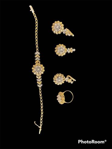 Dəstə daxildir: Üzük, Sırğa, Bilərzik, Sarı qızıl, 585 Əyar, 31 g