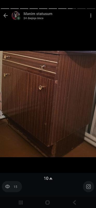 - Komod/kiçik dolab (tünd rəng) – 1 üst çekmece və aşağıda 1 qapılı bölmə, dekorativ tutacaqlar. Ekrandakı məlumat: “10 ₼”.
