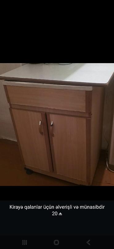 - Mətbəx dolabı (açıq rəng) – üstündə işlək səth, 1 üst çekmece və 2 qapılı bölmə. Kiçik mətbəxlər və kirayə qalanlar üçün əlverişli və münasibdir. Ekrandakı məlumat: “20 ₼”.
