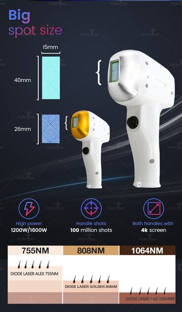 Lazer epilyasiya aparatı – 3 funksiyalı/3 başlıqlı çoxfunksiyalı sistem. - Aleksandrit və diod epilyasiya başlıqları - Tatu silmə başlığı - Karbon pilinq (karbopiling) funksiyası - Korpus üzərində...