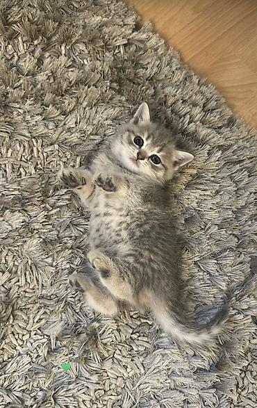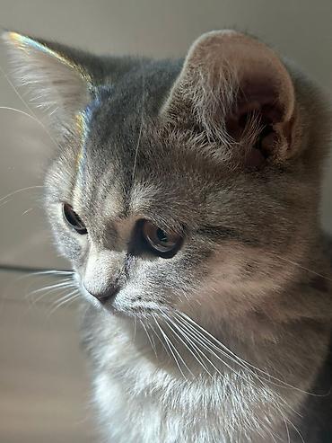 Boz rəngli, zolaqlı və xallı naxışlara sahib gözəl pişik balası. Yumşaq, qısa tüklü kürkü, iri ifadəli gözləri və dümdüz quyruğu var. Evə sevinc qatan şotlant bala 4aylıqdı Peyvəndləri vaxtı vaxtında vurulub hər şey qaudasında.