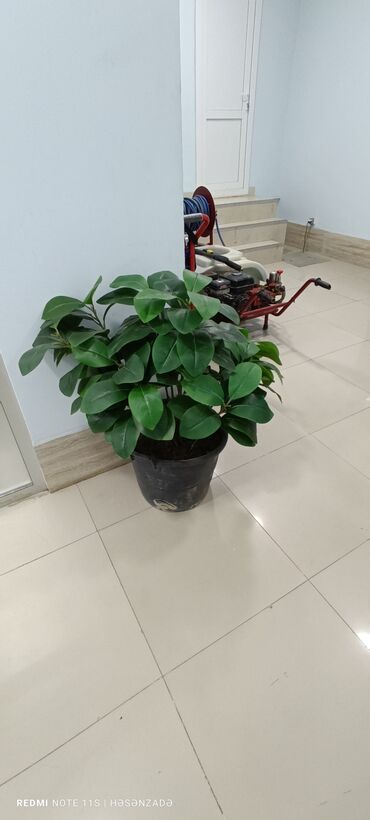 - Kauçuk ağacı (Ficus elastica) – iri, parlaq yaşıl yarpaqlı, qara plastik dibçəkdə. Ofis, zal və dəhlizlər üçün uyğun, havanı təmizləyən populyar otaq bitkisidir. İşıqlı, lakin birbaşa günəşsiz yerləri sevir, torpağı yüngül nəm saxlanmalıdır.