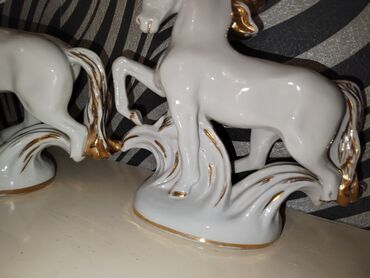 Porşelen at fiqurları – 2 ədəd set qutularinda - Material: parlaq glazurlu porşelen - Rənglər: ağ və qəhvəyi (hər ikisi qızılı detallarla) - Dizayn: iki ayaq üstə qalxmış at kompozisiyası, qaya üz...
