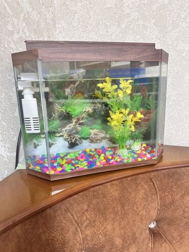 Şəffaf şüşədən hazırlanmış, altıbucaqlı formalı akvarium. Daxili filtri və bəzək elementləri (rəngli daşlar, süni bitkilər və dekorativ daşlar) ilə birlikdə təklif olunur. Akvariumun üst hissəsi tünd qəhvəyi rəngli taxta görünüşlü örtüklə tamamlanmışdır. Balıqlar və digər su canlıları üçün rahat yaşayış mühiti yaratmaq üçün uyğundur.