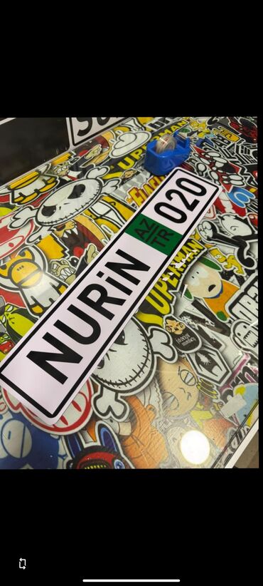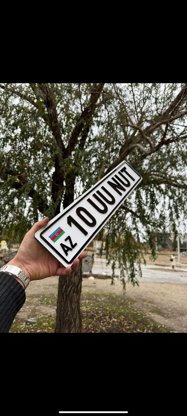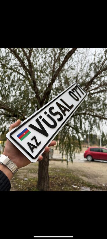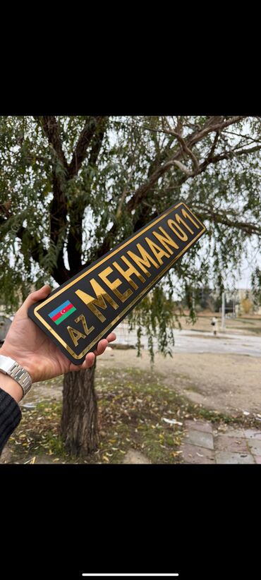 - Avtomobil üslubunda hazırlanmış dekorativ lövhələr. Üzərində “AZ” və Azərbaycan bayrağı elementi, istənilən ad, söz və ya kombinasiyalar (məsələn: “NURİN 020”, “VÜSAL 077”, “10 UUU NUT”, “MEHMAN 011”) tətbiq olunur.