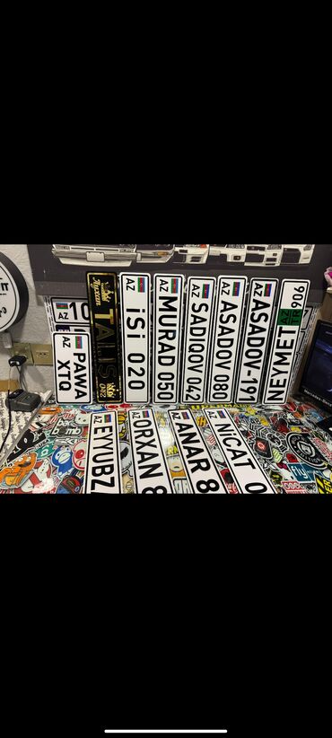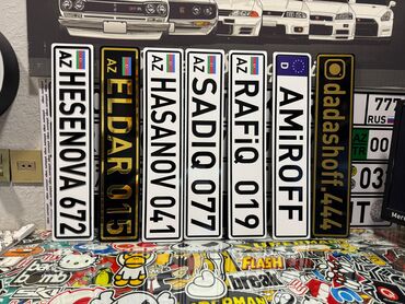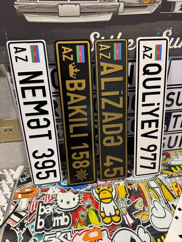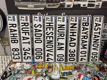 - Avtomobil nömrəsi üslubunda hazırlanmış dekorativ lövhələr. Mətn tam fərdiləşdirilə bilər: ad, familiya, ləqəb, qısa sözlər və ya rəqəmlər.