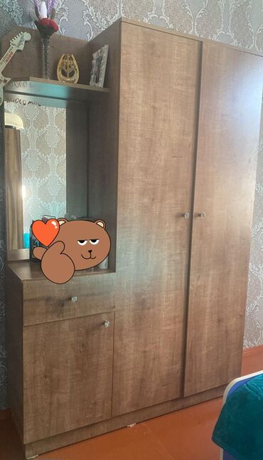 - Komplekt tək blok kimi: sağda iki qapılı şkaf, solda güzgülü tualet/komod hissəsi.
