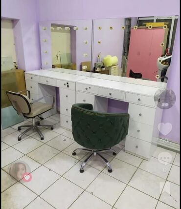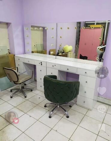 - Vizaj-makeup masası: geniş ağ konsol, çoxsaylı çekmecələr, böyük güzgü paneli, güzgü ətrafında işıqlandırma üçün kartuş yerləri.