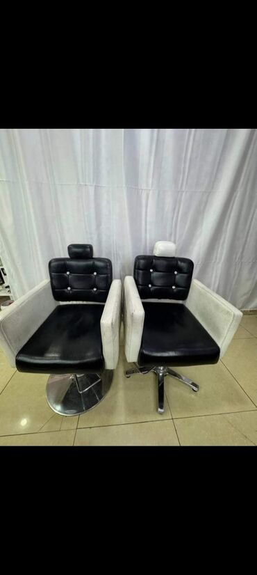 - 2 ədəd saç kəsmə/stilist kreslosu: qara oturacaq və bel hissəsi, ağ qol dayaqları, xrom əsas; biri disk formalı sabit baza, digəri ulduz formalı fırlanan baza ilə.