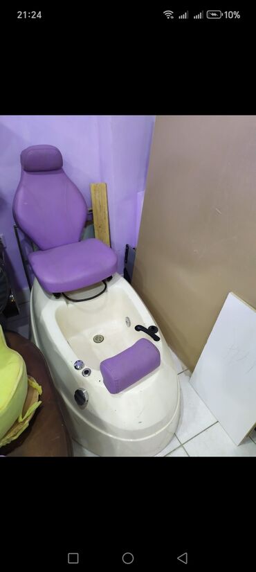 - Pedikür kreslosu və vannası: bənövşəyi süngərlü bel və ayaq dayağı, su boşaltma və qarışdırma klapanları, ayaq üçün yastıqlı dayaq, inteqrə olunmuş oturacaq.