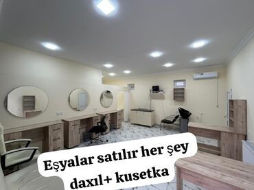 Gözəllik salonu üçün tam təchiz olunmuş mebel və avadanlıq paketi Təsvir: - Vizaj sahəsi: LED işıqlı iri tağ güzgülər, şüşə səthli uzun masa, bir neçə çekmecə, yüksək arkalı bar tipli stullar. - M...