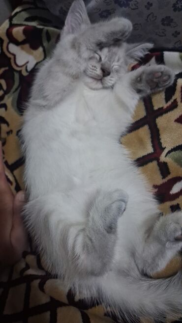 Balaca pişik balası – uzun tüklü, ağ rəngli, baş və quyruqda boz ləkələri var. Mavi-qara parlaq gözlər, çəhrayı burun, yumşaq, tutqun olmayan tüklər. Quzu kimi sakit və qucaq sevir, insanla təmasa ...