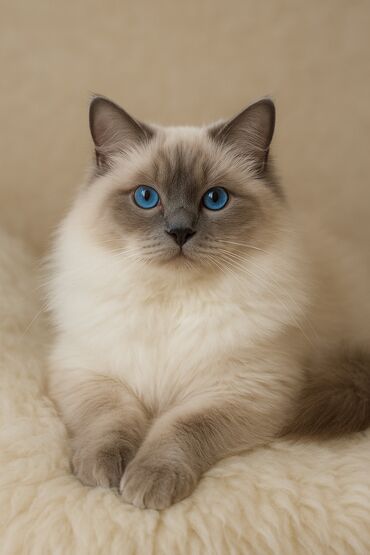 Mavi gözlü, açıq krem rəngli balaca pişik balası. Qısa tüklü, yumşaq xəzə və zərif naxışlı alnı var. Qulaqları iri, burnu açıq çəhrayıdır. Sakit və mehriban xarakterlidir, qucaq sevir, yorğan-döşək...