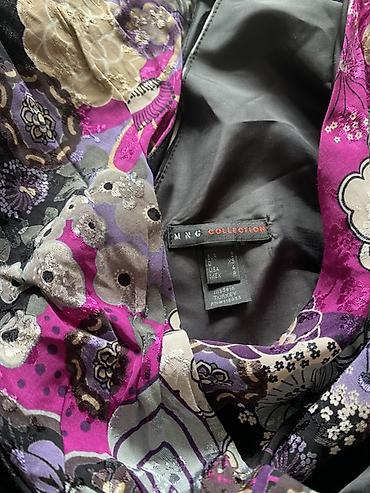 - Yuxarı hissə: bənövşəyi, çəhrayı və boz tonlarda iri çiçək printli, V-şəkilli dərin dekolte, sərbəst enli qısa qollar