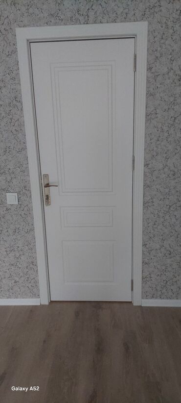 - Hamam qapısı: ağ rəngli panelli interyer qapı, xromdan/bronzdan tutacaq və menteşələr.