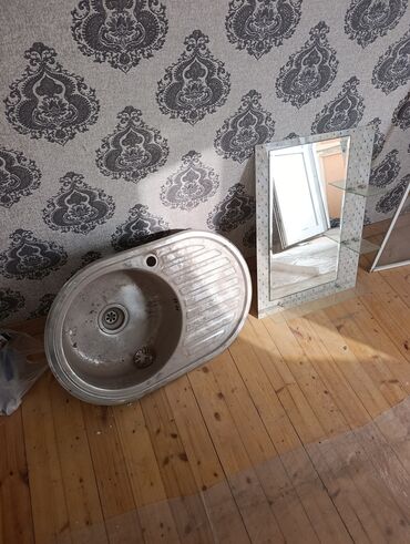 - Hamam güzgülü dolab: kənarları naxışlı güzgü paneli, sağ tərəfdə iki şüşə rəfli açıq bölmə.