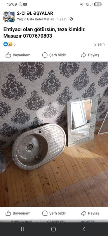 - Ayaqlı hamam lavabosu: oval formalı, keramika kasa, üstündə təkqollu qarışdırıcı kran, əsasda sifon çıxışı hazır. Divar güzgüsü üstündə sabunluq tutacağı görünür.