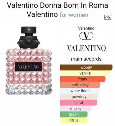- Valentino Donna Born in Roma: ağacsı, vanilli, meyvəli, yumşaq ədviyyəli, ağ çiçək, pudralı, floral, müşk, yaşıl, sitrus nüansları.