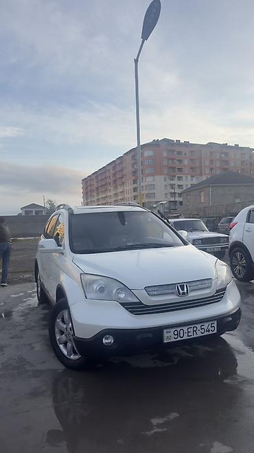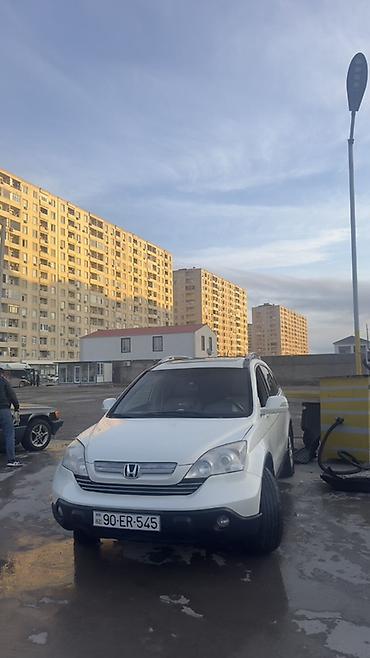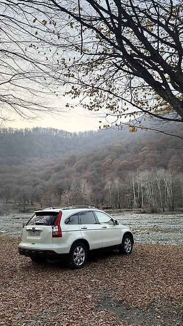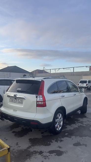 Honda CR‑V, ağ rəngli, 5 yerlik kompakt krossover. Güclü benzin mühərriki və avtomatik transmissiya (şəkillərdəki panel və leverə əsasən) ilə şəhər və uzun yol üçün rahat seçim. Ön və arxa işıqlar inteqrə duman faraları ilə, 17" yüngül lehimli disklər, dam reylinqləri, arxa spoyler və qara qoruyucu bamper əlavələri var. Salon genişdir, arxa oturacaqlar qatlanaraq yük yerini böyütməyə imkan verir. Kondisioner/klimat idarəsi, çoxfunksiyalı sükan, elektrik şüşəqaldıranlar və yan güzgülər, uzaqdan açar, ön sis faraları, arxa şüşətəmizləyən və tündləşdirilmiş arxa şüşələr mövcuddur. Yüksək klirens sayəsində yüngül off-road və kənd yollarında da rahat hərəkət edir. Şassi sabitliyi, ABS, hava yastıqları kimi təhlükəsizlik sistemləri ilə təchiz olunub. Bakı nömrə nişanı 90-ER-545.