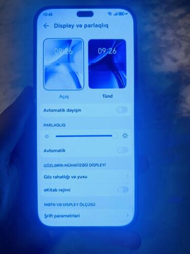 - Ekran: yuxarıda mərkəzə yaxın “pill” formalı ön kamera/ünivermodul kəsiyi; ekran parametrlərində Açıq/Tünd rejim, Parlaqlıq tənzimlənməsi, Avtomatik rejim, Gözlərin mühafizəsi displeyi, Göz rahatlığı və yuxu, eKitab rejimi, Mətn və displey ölçüsü, Şrift parametrləri menyuları görünür.