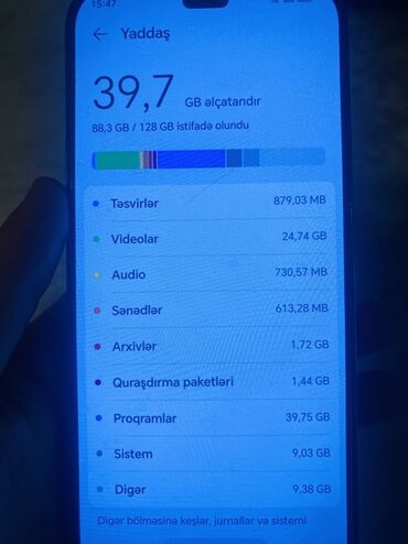 - Yaddaş: 128 GB daxili yaddaş; göstərilən vəziyyətdə 88,3 GB istifadə olunub, 39,7 GB əlçatandır.