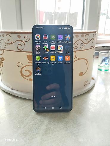 Huawei smartfon - Model: Huawei (şəkillərdəki seriya – arxa hissədə “HUAWEI” loqosu, barmaq izi skaneri və üçlü kamera bloklu variant) - Rəng: qara, parlaq korpus - Ekran: tam ekran dizayn, su dam...