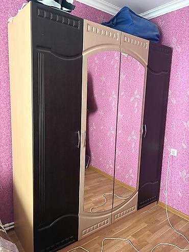 Yataq otağı mebel dəsti Tərkib: - Geniş qarderob: 4 bölməli konstruksiya, mərkəzdə tünd tonlu güzgülü sürgülü/qanatlı qapılar, yanlarda dekorativ relyef panellər, iri halqa formalı tutacaqlar. Aşa...