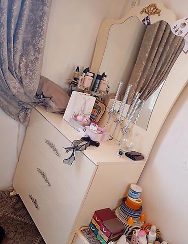 - Komod güzgülü. 3 dərin çekmece, üst hissəsində iri güzgü və yuxarı hissədə dekorativ qızılı ornament.