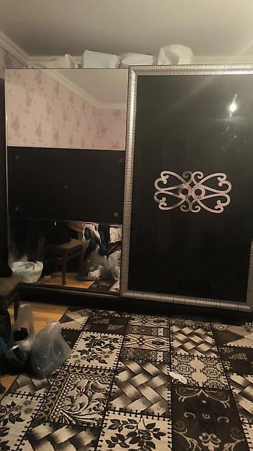 - Şkaf: Sürgülü qapılı iri qarderob, bir qapısı tam güzgü, digər qapısı parlaq qara səthdə gümüş tonlarda dekorativ naxış və relyefli gümüş çərçivə ilə. Daxildə geniş saxlama üçün rəflər və asılqan bölmələri (şəkildə qapalıdır).