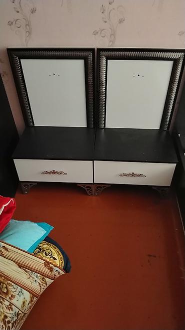 - İki ədəd tumba: qara üst panel, ağ ön hissə, naxışlı qulplar və çəkmece, dekorativ ayaqlar.