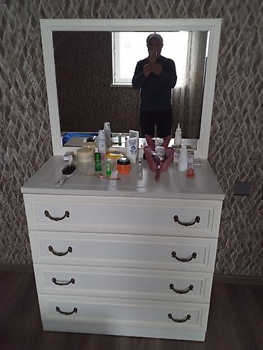 - Komod güzgü ilə – 4 dərin çekmece, üstündə iri çərçivəli güzgü; metal qulplu klassik dizayn.