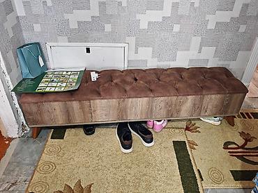 - Giriş və ya yataq otağı üçün yumşaq oturacaqlı skamya-banket: kapitone oturacaq, taxta gövdə və konus formalı dayaqlar, alt hissədə ayaqqabı saxlama sahəsi kimi istifadə oluna bilən boşluq.