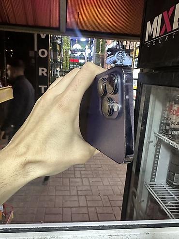 - Şəkillərdə real cihaz göstərilib (üçlü kamera modulu, Dynamic Island və Deep Purple rəngi görünür).