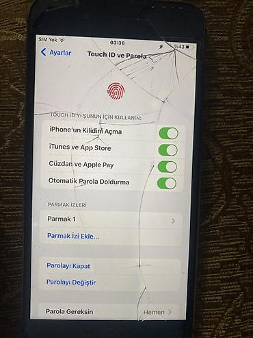 Barmağ izi işlək Ekran orginal True tone işlək Qutusu var Arxa şüşəsi çat çatdı (Qırılıb tökülmüyüb) Pili 51% çoxda saxlamır dəyişməy Lazımdı Kameralar çiçəy kimi 64gb yaddaş Aşağı yeri əlbətdə var...