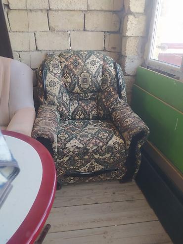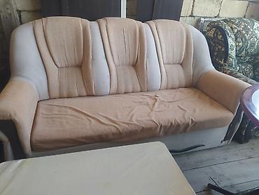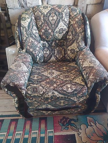 - Rəng və material: Divan – bej/şaftalı tonlarda yumşaq parça; kreslolar – qəhvəyi‑yaşıl tonlarda naxışlı parça