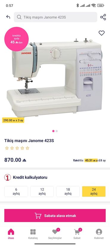 Ev tikişi, təmir, dekorativ işlər və müxtəlif parçalarda dəqiq tikiş üçün münasib modeldir. Model nömrəsi: 423S. Markası: Janome.
