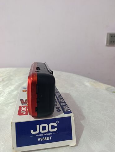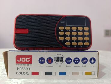 Model: JOC H988BT. Rəng variantları qutuda göstərilib. Portativ istifadə, musiqi və radio dinləmək üçün praktik seçimdir.