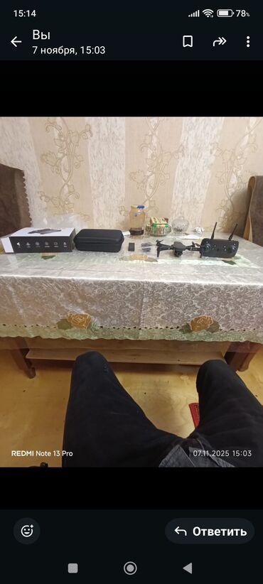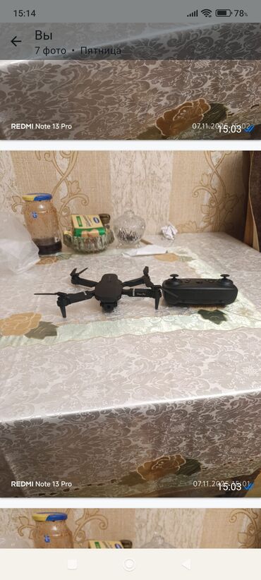 - Komplektdə olanlar (şəkillərə əsasən): dron, iki antenalı uzaqdan idarəetmə pultu, batareya, daşıma çantası, qutu və kiçik aksesuarlar