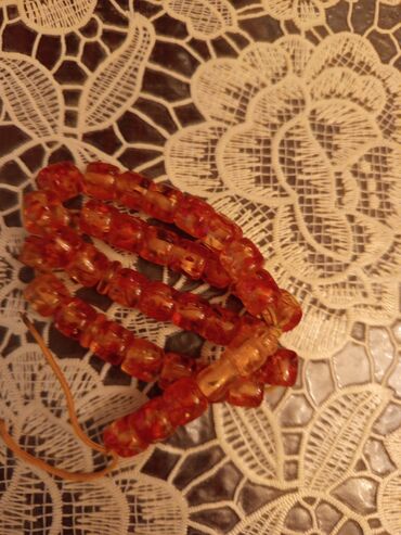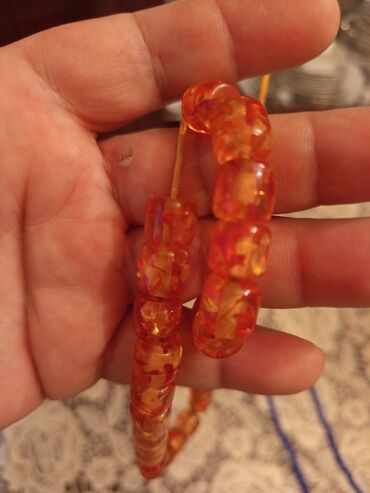 - Material: şəffaf narıncı/kəhrəba tonlarında qətran görünüşlü muncuqlar