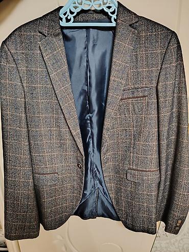 Kişi kostyum gödəkçəsi (şəkildəki). - Rəng: boz/boz-mavi ton - Model: klassik, iki düyməli, ingilis yaxası (notch lapel) - Ölçü: 48 (şəkildə qeyd olunub) - Ciblər: 2 ədəd yan flepli cib, 1 ə...