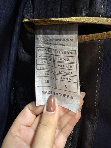 - Digər türk istehsalı etiket: Ölçü 48, Drop 6; parça tərkibi 60% polyester, 20% viskoza, 10% poly, 10% stretch