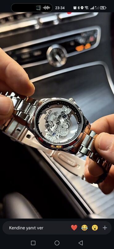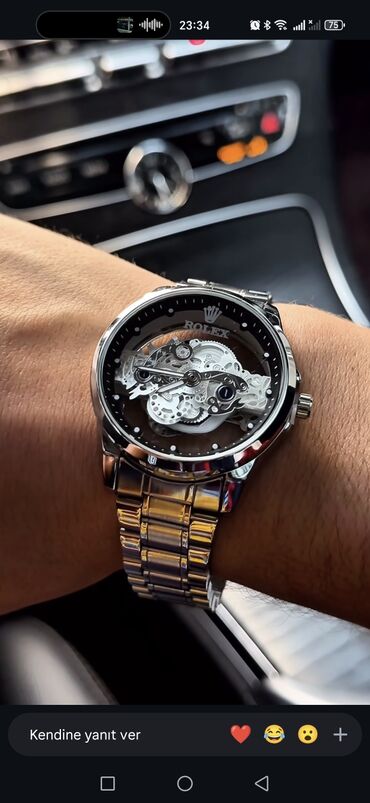 Saat ön üzündə “ROLEX” yazısı və tac loqosu görünür. Şəffaf skeleton siferblat mexaniki quruluşu nümayiş etdirir, avtomobil salonu fonunda çəkilmiş şəkillərdə biləkdə və əldən göstərilib.