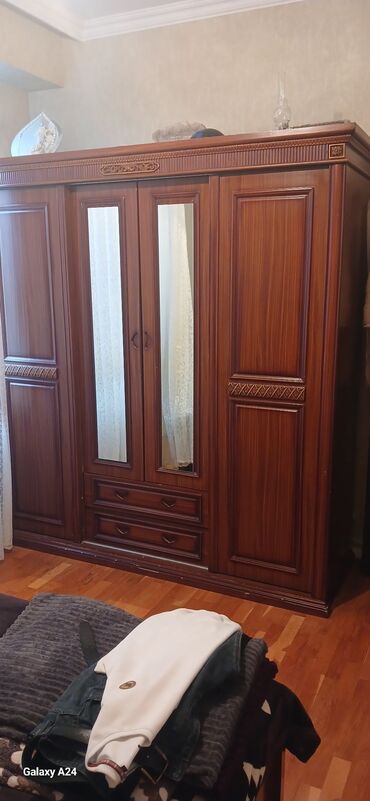 Yataq otağı dəsti – modern və eleqant dizayn Tərkibi: - 4 qapılı, güzgülü qarderob (daxildə asılqan bölmələri, rəflər və şkaf bölmələri) - İki tumba (yan stolçiklər, çekmecəli) - Komod/şkaf güzgü ...