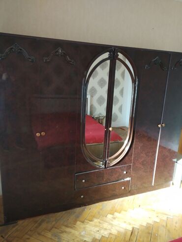 - Geniş qarderob: tünd qəhvəyi rəngli, parlaq səthli, dekorativ oyma elementlərlə. Orta hissədə böyük oval güzgülü iki qapı. Aşağıda 2 geniş çekmece. Yanlarda əlavə bölmələr və asılqan üçün qapılar. Geyim, çarşaf və aksesuarların səliqəli saxlanması üçün çoxlu yer.