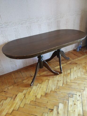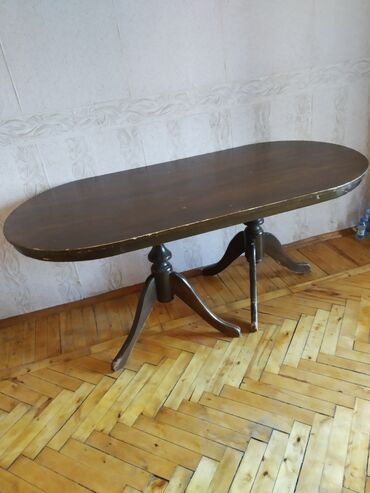 - Oval yemək/oturma otağı masası: tünd taxta üstlük, iki mərkəzi dayaq və hər dayağın üçayaqlı klassik ayaq quruluşu. Uzun, rahat masaüstü gündəlik istifadə və qonaqlama üçün uyğundur.