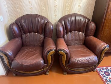 - Material: tünd qəhvəyi rəngli təbii dəri üzlük, bərk ağac dekor elementləri və dayaqlar
