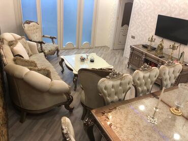 Barokko üslubunda mebel dəstləri 1) Qonaq otağı dəsti: - 3 nəfərlik klassik divan, bəzəkli qızılı oyma detallar, taxta ayaqlar - Eyni üslubda geniş kreslo - Dekorativ naxışlı yastıqlar - Pastel/be...